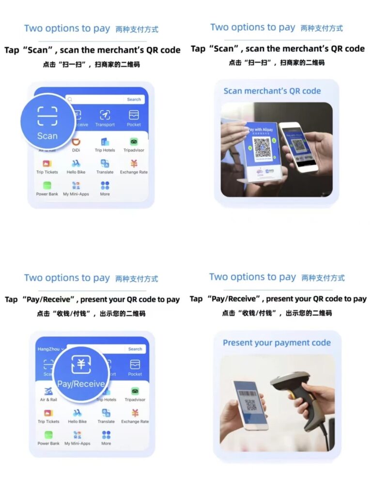– You scan the merchant’s code: Use Alipay’s “Scan” function to read the merchant’s QR code, enter the payment amount manually, and confirm the payment.