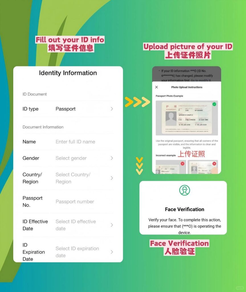 4. Complete identity verification: Enter your full name (exactly as it appears on your passport), upload a clear photo of your passport’s main page, and fill in your current address (avoid commas or special characters in the address field).