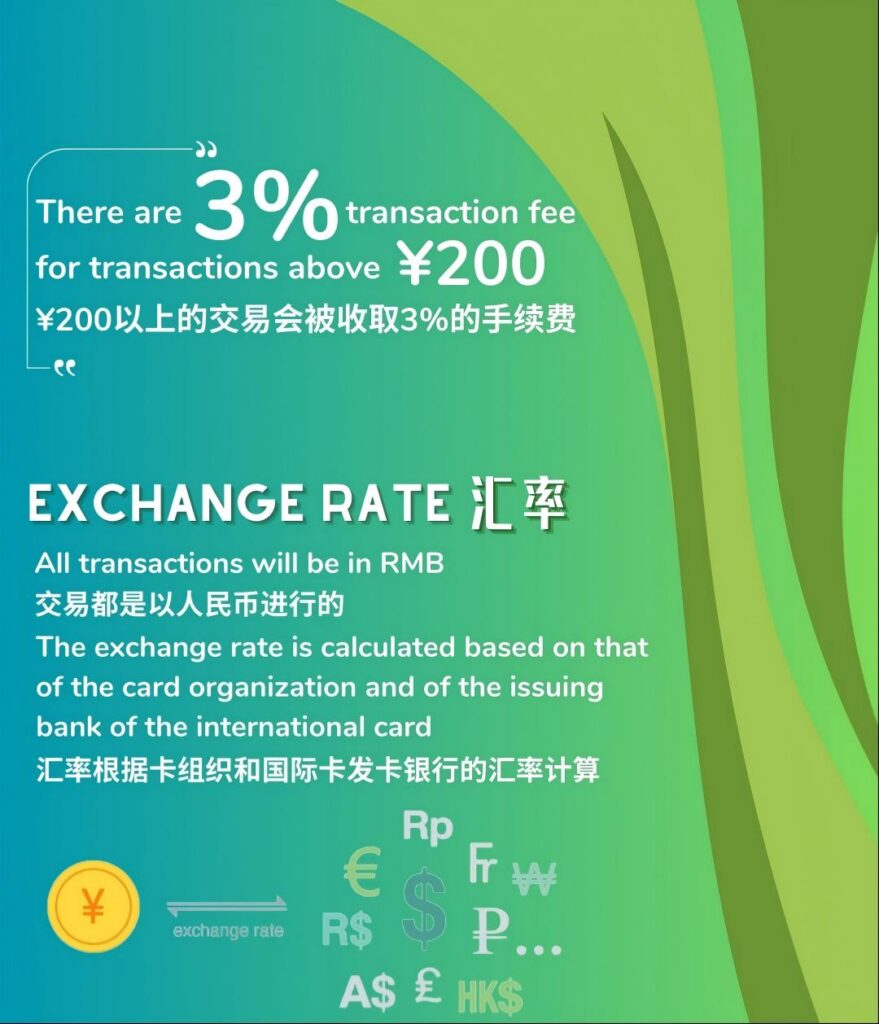 - Fees: Transactions under 200 RMB are fee-free. For amounts exceeding 200 RMB, a 3% international transaction fee is applied. Ask merchants to split large purchases into smaller transactions to waive this fee.